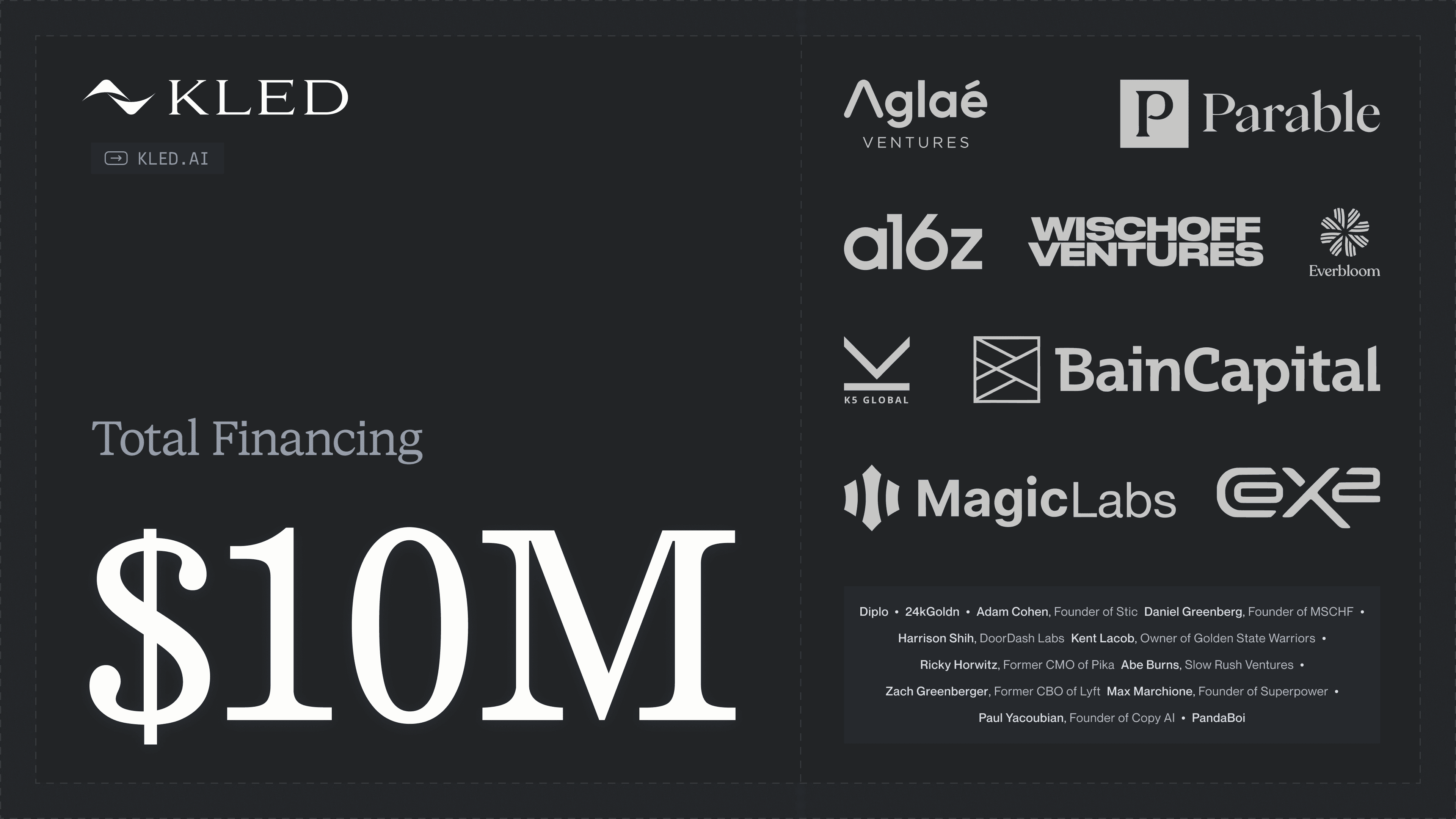 Backed by Wischoff VC, Aglaé (Venture Fund of Bernard Arnault), K5 Global, Diplo, Parable VC, Cox Exponential (CX2), Daniel Greenberg (Founder of MSCHF), Harrison Shih (DoorDash Labs), Kent Lacob (Owner of Golden State Warriors), and more.